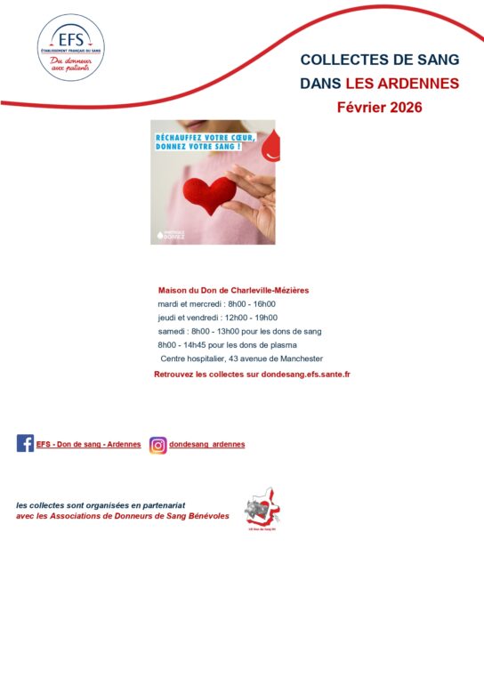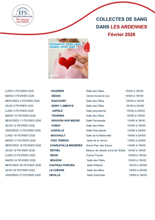 Tout au long du mois de Février, de nombreuses collectes mobiles seront organisées sur l’ensemble du territoire ardennais afin de permettre au plus grand nombre de donner près de chez eux. Vouziers, Sedan, Raucourt, Signy l’Abbaye, Asfeld, Tournes, Nouvion sur Meuse, Fumay, Juniville, Machault, Poix-Terron, Charleville-Mézières, Rethel, Revin, Mouzon, Chateau Porcien, Le Chesne ou encore Deville accueilleront successivement les équipes de l’EFS, avec des créneaux horaires adaptés en journée et en fin d’après-midi. La Maison du Don de Charleville-Mézières, située au centre hospitalier avenue de Manchester, reste également ouverte tout au long du mois avec des plages horaires élargies en semaine et le samedi matin pour les dons de sang et de plasma.