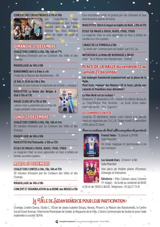 Deux grands temps forts marqueront ces festivités : la Parade de Noël du samedi 13 décembre, réunissant associations et écoles de danse pour un défilé lumineux et musical dans les rues de Sedan, ainsi que le spectacle déambulatoire « Paradis Blanc » de la compagnie Les Têtes en l’Air, proposé le dimanche 14 décembre. Mascottes de la Pat’Patrouille, de Disney ou encore de la Reine des Neiges se joindront également à la fête pour aller à la rencontre du public.